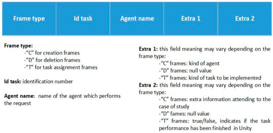 The Communication Agent (CA) is in charge of attending the requests that arrive from Unity, carrying out the tasks that correspond according to the frame exchanged. The frame that is sent in each request contains the components shown in Figure 9.