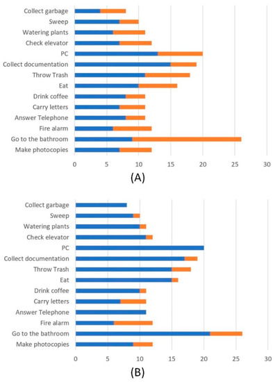 First, a simulation of 15 min is planned. For the initial set-up of the different agents that represent actual workers within the organization, a Human Resources manager established a simulation of a total of 8 agents, whose department was assigned proportionally to the amount of workers of each department that were working at the company −1 receptionist, 2 maintenances and 5 administrative. Three of them have reduced mobility problems, three are visually impaired and one is deaf. The assignment of the work places for each of the agents was made just according to the productive processes that take place in the organization, without taking the possible architectural barriers that they might find into account. Once the environment and the agents’ distribution and characteristics were set up, the simulation can take place in the 3D viewer. After the simulation, the tool generates a detailed report with the accessibility problems that the avatars have encountered, which have impeded the achievement of the tasks assigned to them. 118 were successful and 79 failed (Figure 11A). Some of the deficiencies found were: (i) The lack of adapted bathrooms in the building; (ii) working places not adapted for people with visual or hearing disabilities: impossibility to perform tasks such as answering the telephone, or being aware that the fire alarm is active; (iii) lack of ramps that enable the access to higher floors as an alternative to the elevator, which in case of breakdown would obstruct the access or exit to the building; (iv) limited access to certain work stations-spaces not large enough for access with wheelchairs or; (v) not accessible furniture elements–file cabinets, photocopiers.