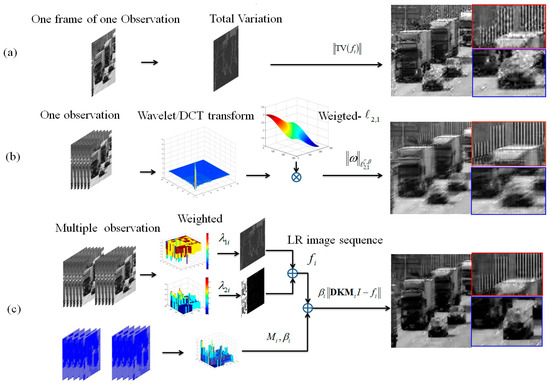 Basic flow of maximum a posteriori probability and Markov random field (MAP-MRF) based reconstruction approach. The close-ups marked by red rectangles represent the still background and the close-ups marked by blue rectangles represent the motion foreground. Proposed MAP-MRF-based algorithm uses more observation than other algorithms to utilize redundant inter-frame information. (a) the basic flow of generalized alternating projection (GAP) with total variation (TV) regularization; (b) the basic flow of GAP with wavelet and discrete cosine transform (DCT); (c) the basic flow of MAP-MRF-based approach.