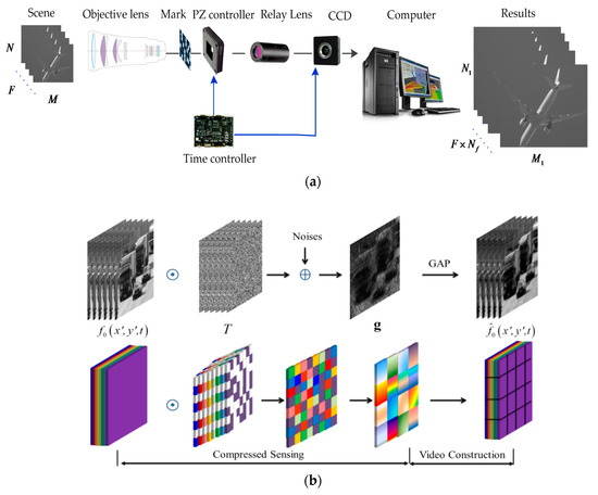 The illustration of the coding mechanisms within the coded aperture compressive temporal imaging (CACTI) system. (a) The system structure of CACTI; (b) the measuring principle of CACTI.