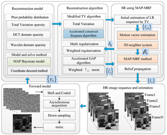 Table 1 summarizes frequently used notations in this paper. The paper has been organized into the following sections. Section 2 introduces the fundamental principles, forward model, and Bayesian model for CACTI image super-reconstruction; Section 3 introduces the proposal of a multi-regularization reconstruction algorithm and MAP-MRF-based reconstruction approach utilizing inter-frame redundant information; Section 4 describes the implementation of the proposed SR approach; and Section 5 involves the comparison and discussion of the proposed approach.
