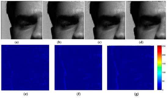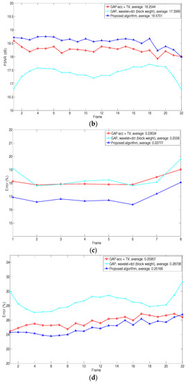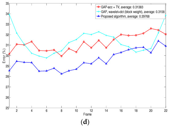 Comparison of reconstruction results of different datasets: (a) PSNR for each reconstructed frames of Traffic dataset ( = 8); (b) PSNR for each reconstructed frames of Traffic blink dataset ( = 22); (c) reconstruction error for each reconstructed frames of Traffic dataset ( = 8); (d) reconstruction error for each reconstructed frames of Traffic blink dataset ( = 22).