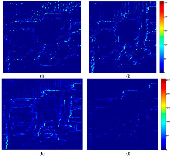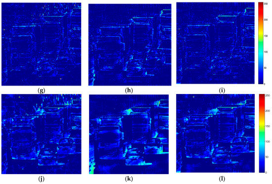 Reconstructed frame 8 for the traffic dataset by multi-regularization algorithms for comparison: (a) frame reconstructed by GAP-acc + TV algorithm with ; (b) frame reconstructed by GAP + b algorithm with ; (c) frame reconstructed by proposed algorithm with ; (d) frame reconstructed by GAP-acc + TV algorithm with ; (e) frame reconstructed by GAP + b algorithm with ; (f) frame reconstructed by proposed algorithm with ; (g) the residual images of (a); (h) the residual images of (b); (i) the residual images of (c); (j) the residual images of (d); (k) the residual images of (e); (l) the residual images of (f).