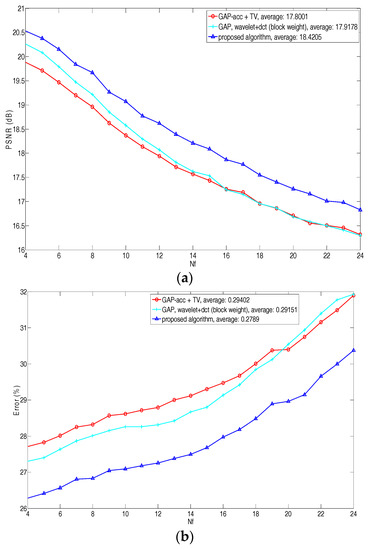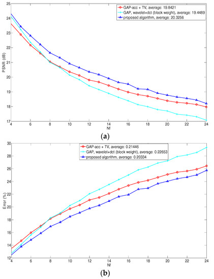 Yang J. et al. [10,11] proposed a Gaussian Mixture Model (GMM)-based inversion method that can reconstruct video frames with greater fidelity than other methods for certain synthetic and real data through the on-line or off-line dictionary learning. An online-updated GMM algorithm was robust in different scenes and motions, especially in simple movements. For fast and complicated movements, the offline-learned GMM algorithm with related training videos can yield promising results. In their comparison, however, the GAP algorithm had not been optimized for certain scenes and adopted only the default values for the weighting coefficient. Hence, it is necessary to choose the algorithm in accordance with the natural scenes. Additionally, the GMM algorithm is faster than GAP in parallel calculation, but slower in serial calculation.