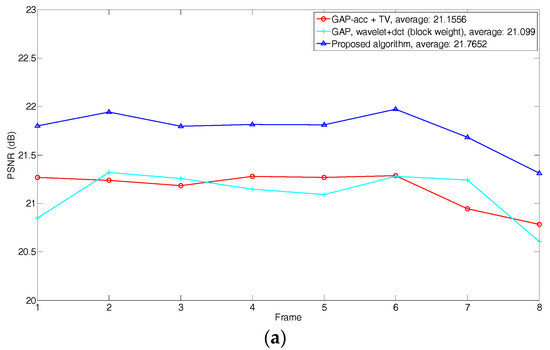 The performance of GAP + b drops significantly when the compression ratio grows. As Figure 8 demonstrates, the proposed algorithm performs significantly better than GAP + b and GAP-acc + TV in terms of PSNR when the compression ratio is less than 24. It is robust enough to be applied under available compression ratios for video CS.