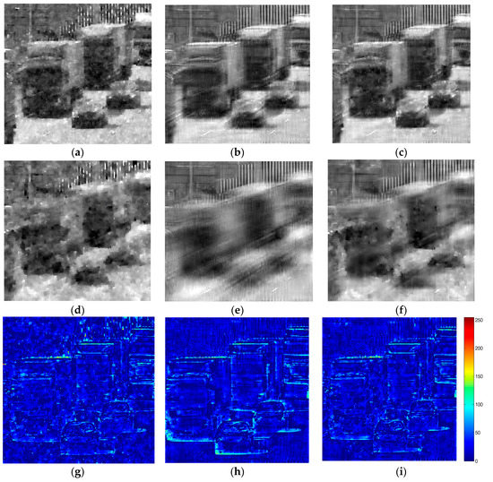 For detailed comparison, one arbitrarily selected frame from each of the reconstructed SR sequences is shown in Figure 12. It should be noted that our result is an improvement of the time and spatial resolution simultaneously, and the results were scaled to facilitate the comparison to others. The estimation results of different algorithms are used as the initial input of the LR sequence, and the output results reconstructed by MAP-MRF-based approach can reflect the error propagation. As shown in Figure 12i,j, both GAP + b algorithm and GAP-acc + b algorithms cause the error propagation, especially at the edge of the motion target. In the proposed MAP-MRF approach, the multi-regularization algorithm and coarse-to-fine scheme can address error propagation and significantly improve the performance.