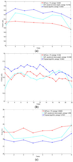 The basic flow of the proposed approach is shown in Figure 1c, which is calculated for the data from multiple observations comparing the GAP algorithm. For simplicity, the basic flow is illustrated only with two observation data. Some close-ups marked by red or blue rectangles in each frame are enlarged and presented below the corresponding frames. The close-ups marked by red rectangles are still background and close-ups marked by blue rectangles are motion foreground. Compared with the existing GAP algorithm, the proposed approach can provide high visual quality in the foreground and background of a scene simultaneously and enhance the fidelity of the reconstruction results.