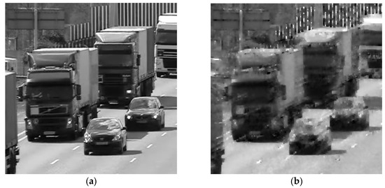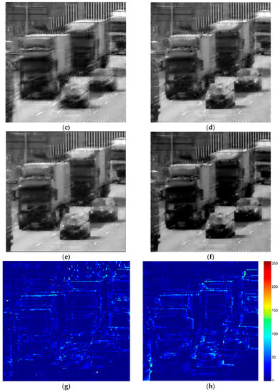 Reconstructed results using multi-regularization algorithm and residual for the traffic dataset are shown in Figure 6. Frames reconstructed with GAP + b look better in the background but exhibit ghosting effects in the foreground due to ambiguities in the solution. The GAP-acc + TV can generally reconstruct the frames with sharper scenes than GAP + b but exhibits information loss and over-smoothness of reconstructed results. Compared with other algorithms, the proposed multi-regularization algorithm can provide richer texture information and sharper structure both in the background and foreground. When , the reconstructed result drops significantly, but the proposed multi-regularization algorithm can still identify the target in the scene. Visual quality evaluations on the reconstructed frames are consistent with the peak-to-peak signal-to-noise ratio (PSNR) results and residual images shown in Figure 7.