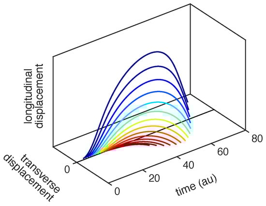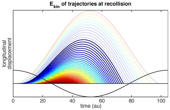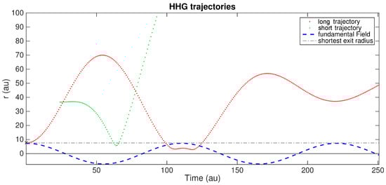 In Figure 2, examples of short trajectories are drawn, always with an initial transverse momentum . For each set of initial conditions , a specific two-colour delay can be found for which the transverse displacement cancels out. The trajectory then returns to the parent ion at return time and can contribute to the HHG spectrum. The transverse velocity is the most probable initial condition both in the adiabatic case [30,31] and in the non-adiabatic (almost) linear case [32,33]. Therefore, the HHG signal of harmonic order n is maximised exactly for