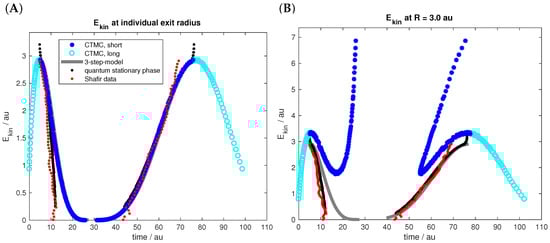 For the subsequent propagation, classical Newton’s equations were solved in two versions, using the MATLAB (R2016a, MathWorks® Inc., Natick, MA, USA) native ode45 function. This 4th order Runge–Kutta scheme employs 5th order error estimates, and adapts the time-steps to fulfill a relative error tolerance of . The first version of the equations of motion are according to SFA, where the force term only includes the electric field. The second version propagates in the superposed forces of the electric field pulse, the ion Coulomb force and the field induced dipole on the ion. The latter corresponds to the TIPIS model (Tunnel ionisation in Parabolic coordinates with Induced dipole and Stark Shift) [39,40]. More details of the CTMC implementations can be found in [35,41].
