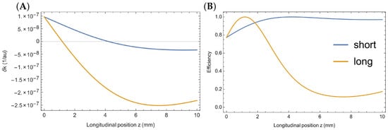 (A) phase mismatch for an example long and short trajectory, depending on the position of the gas jet after the laser beam focus; (B) phase matching efficiency for two example trajectories depending on the position of the gas jet z.