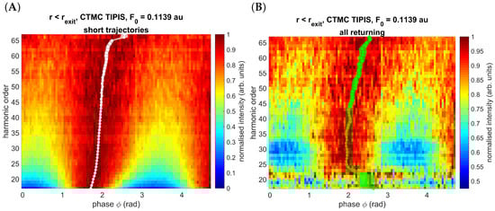 Figure 6 contrasts two displacement gate plots. In Figure 6A, only short trajectories are considered, with their probability weights given by . In Figure 6B, the HHG spectra were calculated by summing up the corrected weights from Equation (15), including also long trajectories. The effect for higher harmonic orders is relatively small. However, including long trajectories does yield a change in the slope of the curve, similar to that found in the experiment (see Figure 9). Figure 6B is much noisier than the plot focusing on only short trajectories Figure 6A. While there are more trajectories included in Figure 6B, the increased number is not enough to completely compensate for the additional statistical fluctuation due to the introduced complex phase for all trajectories.
