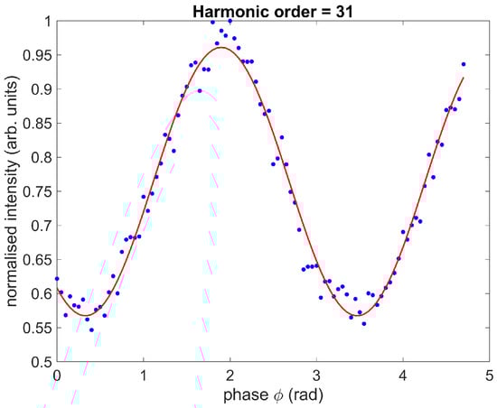 function, where describes the contrast of displacement gate and is the constant background intensity. As an example, Figure 7 shows the line out for harmonic order 31 of the dataset displayed in Figure 6A, together with the fitted function.