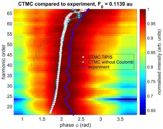 The retrieved for the two different simulation cases are shown on top of the experimental displacement gate plot in Figure 8. Neglecting the Coulomb potential (cyan) does not have any significant effect on the HHG spectra for most of the harmonic spectrum. Comparable are found both in the CTMC with Coulomb and the CTMC without Coulomb cases, and only around the cutoff energy do the two curves diverge. In addition, the curves extracted from the different CTMC simulations show remarkable agreement with the experimental spectrum for harmonics . A constant shift between the experimental and CTMC values can be attributed to the unknown absolute phase difference in the experiment [18].