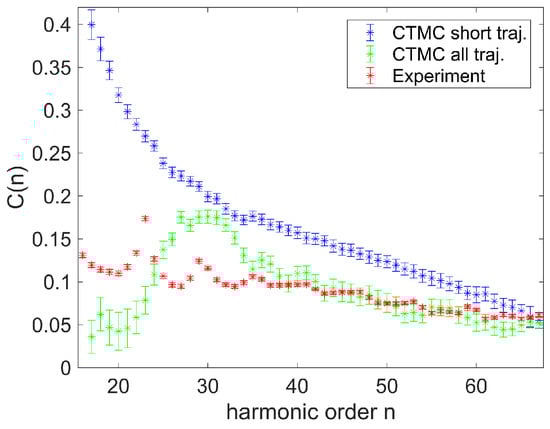 Additionally, the oscillation contrast of the displacement gate plot especially for the lower harmonic orders is reduced by adding long trajectories. Compare again the two plots in Figure 6. Figure 10 highlights that the displacement gate contrast in the CTMC with only short trajectories is much stronger (blue) than the contrast in the experiment of [18] (red). In the case when long trajectories are considered as well (green), the contrast drops to comparable values.