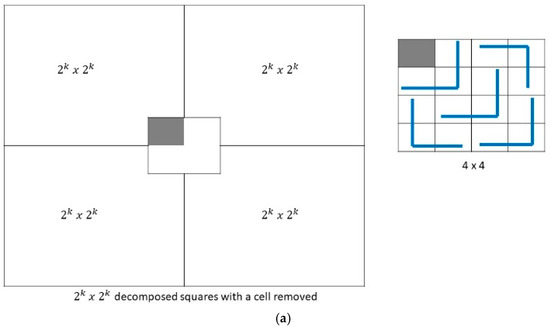Similarly, with condition 2 Theorem 3, we are considering an M (10 × 10) rectangle. The considered rectangle can be split into a 7 × 7, 6 × 3, 3 × 6, and 4 × 4 sub-rectangles shown in Figure 6b. According to Lemma 3 a 7 × 7 rectangle with one square removed can be tiled with ‘T’ tromioes. Similarly, with the help of Lemmas 1 & 2, we know that 6 × 3, and 3 × 6 can also be tiled with ‘T’ trominoes. For a 4 × 4 square, it is proven that a when k can be tiled with ‘T’ tominoes as shown in Figure 6a. Hence, it is proved that a rectangle with even sided can be tiled using set of ‘T’ tromino pieces.