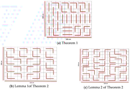 Figure 13c, shows the corresponding tiling set generated based on Theorem 2, Lemma 2. In the fourth set of experiments, obstacles were inserted within the test area in order to modify the area based on Theorem 3, Lemma 3. We utilized a square area of 154 cm × 154 cm, subdivided into 11 × 11 square grids. According to the assertion of Lemma 3, this modified area can be tiled using a ‘T’-set of tetromino pieces. Figure 13d illustrates the universal tiling set that was auto-generated based on Theorem 3, Lemma 3. The fifth set of experiments focused on validation of Theorem 3, Lemma 4. The test was performed within a square area of 140 cm × 140 cm, further subdivided into 10 × 10 square grids. To meet the requirements of Lemma 4 towards realizing a modified rectangle, obstacles were inserted into the middle of the test area. The global tiling set that was auto-generated based on Lemma 4 can be seen in Figure 13e.