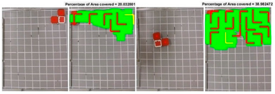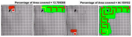 In the fourth and fifth set of experiments, obstacles were placed inside the testing area as a means of modifying the test space as required by the Lemma. The boundaries of the testing area were adjusted according to the arguments in Lemma 3 and 4 of Theorem 3. We computed the total area covered by excluding the pixels associated with the obstacles by utilizing Equation (2). Figure 19 depicts the area coverage process while validating the application of Lemma 3. Results clearly show that hTromo robot covered an area in excess of 97% of the total test area, thereby validating the application of the Lemma 3 of Theorem 3. Similarly, with experiments involving Lemma 4, the hTromo robot covered an area of over 95% of the total test area. Figure 20, presents the tiled area during the different stages of a fifth and final set of experiments.