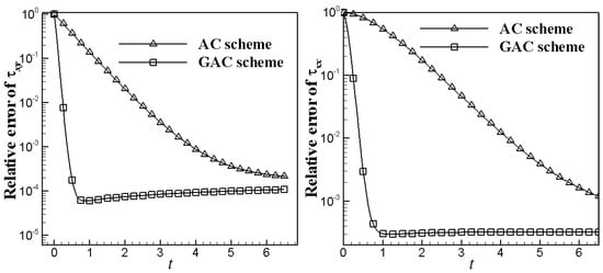 Generally speaking, at low Wi number, asynchronously coupled method can get a stability result in simulations only if the and can guarantee the adequate resolutions of each solvers because of the small scale-separation. The value of N is related with the ratio of time-step sizes , but is usually not linear with respect to it. In practical applications, N is found by the trial and error approach. For instance, we initially set N0 = 2h, , present round to ceiling. We can take N = N0, if the iterative error of was decreased when N = N0, other else we use N0 = 2h+1 to test once again, and so on. We first run simulations using and with the fined mesh of 400 × 40, and N = 5 for generalized asynchronously coupled method, at lower Wi = 1, and get the results in the Figure 3, comparing AC scheme with GAC scheme. We find that despite both AC scheme and GAC scheme can get a stability result in simulations, the convergence speed of GAC scheme is fast than the AC scheme.