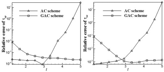 So, we also can study the numerical precision of the presented method by comparing with the exact solution. The relative errors of numerical solutions for stress based on the L2-norm are given by