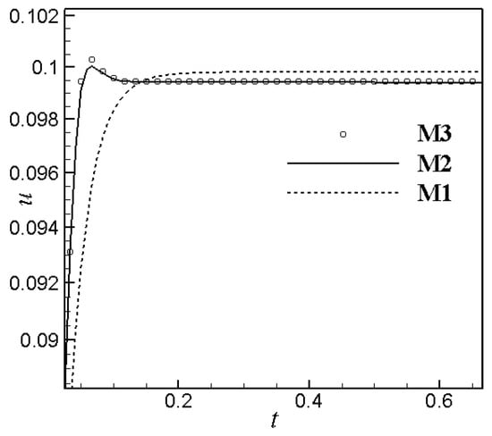 To show the validity of the generalized asynchronously coupled method, we then take the dimensionless units as 0.1, as 1, Wi = 15.0, parameter as 0.5, and = 1, Re number as 1.0, then , , and compare the numerical results of our method with the analytical solution and asynchronously coupled scheme. We also set and for coupled using the fined mesh of 400 × 40, and N = 5 for generalized asynchronously coupled method. Figure 4 shows that the relative error of and simulated by our present scheme is extremely small at Wi = 15, whereas the relative error of obtained by asynchronously scheme is clearly exceeded more than 100%. In other words, the asynchronously coupled method is considerably subject to numerical error at Wi = 15. Nevertheless, when comparing with the standard asynchronously coupled methods, the generalized method persists to give stable solutions up to Wi = 15. Overall, seeing from the analysis of relative error, we found that the present method could be immune to problem of Wi = 15. Moreover, we plot the velocity components u, as obtained by numerical method at centre point (5, 0.5) on time t in Figure 5, comparing with the results of the asynchronously coupled method at and Re = 1.0. From Figure 5, we found that, before eventually reaching a steady state, the velocity profiles overshoot the terminal velocity due to the action of the elasticity. However, the result of the asynchronously coupled method is divergent as the time increasing because of its poor stability.