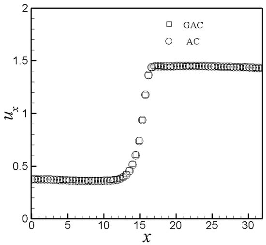 The numerical solutions of velocity components through the horizontal centerlines with Wi = 1.0, comparing between the results of GAC and the AC, respectively.