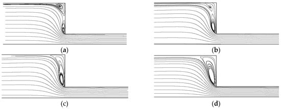 The instantaneous streamlines of the flow with Wi = 5.0: (a) t = 8, (b) 16, (c) 24, (d) 30.