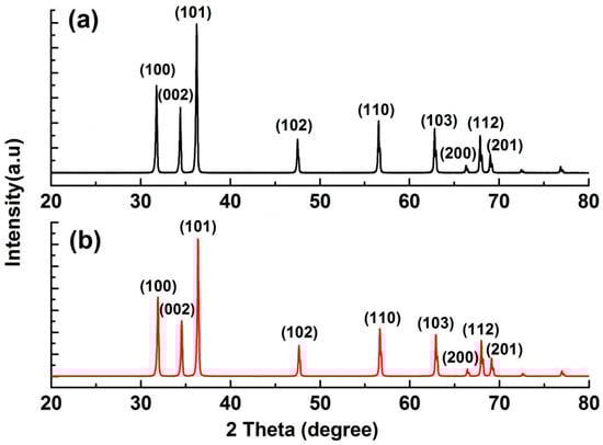 XRD spectra of different ZnO nanoparticles (NPs): (a) Sample A; (b) Sample B.