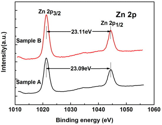 To determine the chemical state of the ZnO nanoparticle surfaces, XPS measurements were performed. From Figure 3, one can find that the energy differences between the Zn 2p3/2 and Zn 2p1/2 peaks of the two samples are 23.09 and 23.11 eV, respectively. These values are within the range of the XPS standard reference value of ZnO []. The Zn 2p XPS peak is sharp, and its corresponding binding energy indicates the presence of Zn2+ lattice ions [].