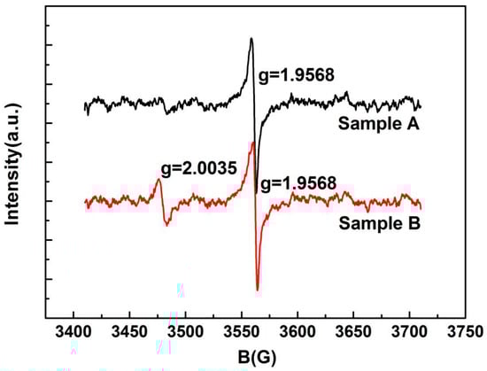 However, a significant EPR signal with a g factor of 2.0035 was detected in Sample B. This is commonly attributed to an unpaired electron trapped in an oxygen vacancy site [,,]. Hence, a stronger g-2.0035 EPR signal corresponds to the higher concentration of oxygen vacancies in ZnO. The surface of Sample B has more oxygen vacancies than the surface of Sample A.