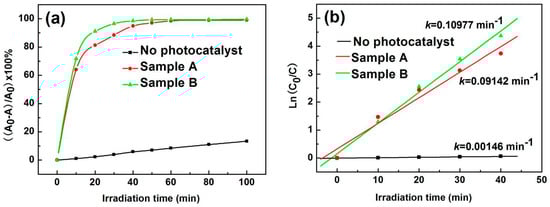 In general, dye molecules are gradually adsorbed on the surface of a catalyst, before the photocatalytic reactions occur, and ultimately reach saturation. According to Equation (1), the percentages of MB absorbed on the surfaces of Sample A and Sample B during its adsorption–desorption process (30 min), were 2.3% and 4.2%, respectively. This clearly shows that a large number of oxygen vacancies on the surface of ZnO NPs contribute to the adsorption of dye molecules onto the photocatalytic surface. Figure 7a shows the decomposition of MB (4 mg/L), using different ZnO nano-catalysts exposed to UV light. Remarkably, MB is unstable under UV irradiation, and over 13% of the dye was photo-decomposed, even in the absence of a catalyst.