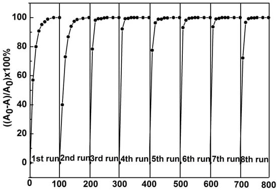 Both the stability and recyclability of photocatalysts are extremely important for practical applications. Figure 8 shows the results of cycling tests of the UV-light driven photocatalytic activity of Sample B in degrading MB. Sample B shows good photocatalytic activity under UV-light irradiation, and no appreciable loss of activity after eight cycles. The remarkable photocatalytic stability of the vacuum-treated ZnO NPs indicates its feasibility in practical applications.