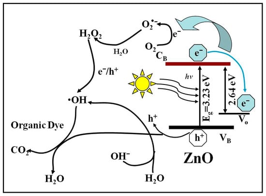 As mentioned above, oxygen vacancies play an important role in the degradation of dye under UV-light irradiation. They create an impurity level between the CB and VB of the vacuum-treated ZnO, which acts as a deep donor defect level, near the top of VB []. The Vo defect energy levels used in Figure 9 are obtained by calculating the emission energy (2.64 eV) corresponding to the peak around 470 nm (PL spectrum shown in Figure 6). The calculated bandgap energy of 3.23 eV corresponds to the band-edge emission peak at around 384 nm, as shown in Figure 6. Indeed, an “empty” oxygen site (Vo2+) can trap either one (Vo+) or two (Vo0) electrons [], thereby effectively reducing the recombination rate of the ecb−–hvb+ pairs. More ecb− and hvb+ migrate to the surface of the vacuum-treated ZnO and promote the photocatalytic degradation reactions.