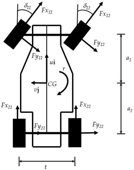 where and are the wheel steering angles, respectively the front left and front right, and are the longitudinal (x) and lateral (y) road-tyre forces at each corner (i = 1 for front and i = 2 for rear, j = 1 for left and j = 2 for right).