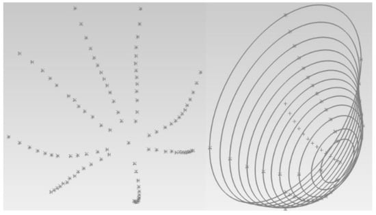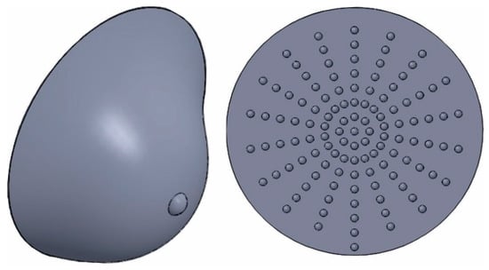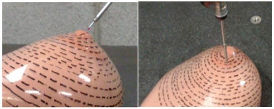To take the measurements on the medical mannequin, concentric circles were traced along the surface of the mannequin’s breast, which were distributed uniformly [39]. The measurement time for a single breast with the available coordinate measuring machine took 5 min.