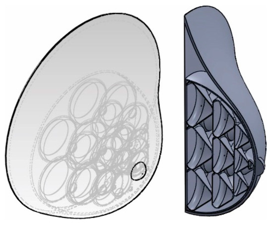The distribution of lobes in the prosthesis was placed within a circular adjustment with the aim of taking advantage of the qualities of this adjustment with respect to the deformation fields and to the distribution of stress. The circumferential adjustment is used when it is necessary to obtain a uniform distribution of loads or stress in components. The lobular cavities gradually increase in size the closer they are to the back part. This arrangement also has an element of connectivity with the nipple, just as in the real lobular arrangement—following the pattern of the petals of a daisy. Figure 5 shows the complete 3D model; in this image, the placement of the lobular structure and the circular adjustment in the inside of the prosthesis shell can be seen.