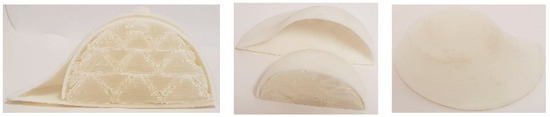With respect to the lightness of the prosthesis, the proposed prosthesis (with biomimetic technique) for a patient with a complete mastectomy who used a C cup has an approximate mass of 0.7 kg (6.86 N), which is acceptable considering that she uses a C cup. Undoubtedly, weight is also a determining factor in the dynamic and realistic behavior of the breast. In this sense, the proposed prosthesis improves the mechanical properties of the same due to its internal structure. To verify dimensions, geometry, adjustments, and final finish of the prosthesis, a rapid prototype was built with ABS material. The first prototype of the design is shown in Figure 6 and it was confirmed that the qualities of the prosthesis mean that it can be manufactured simply and economically.