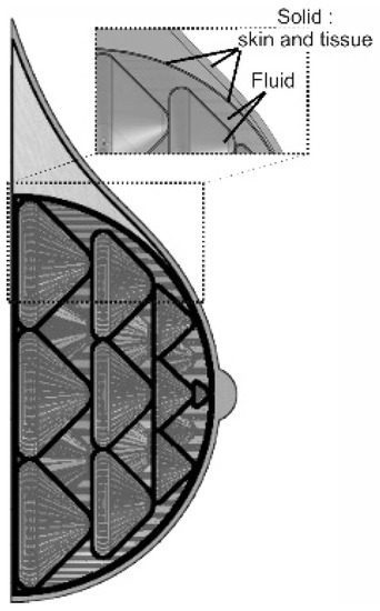 Different breast models have been developed using finite elements in particular cancer detection studies or in the design of brassieres with different uses. The models are solid volumes without any frills in the inner part. The model developed in this work specifies the inner part of the prosthesis using the biomimetic technique. In the different geometries of the designed breast prosthesis model, three structure types were considered: the outer shell, the internal structure, and the spaces formed by the former two. Figure 7 shows the structure and the interaction of elements considered for the prosthesis model, such as solid elements (skin and tissue) and the fluid zones. Different breast models have been developed using finite elements in particular cancer detection studies or the design of brassieres with different uses. The models are solid volumes without any frills in the inner part. The model developed in this work specifies the inner part of the prosthesis using the biomimetic technique.