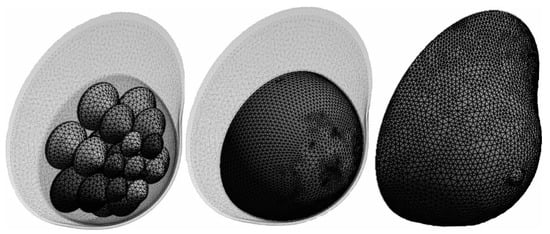 In the external structure, 2 mm of thickness with a Young modulus of 10 Kpa, Poisson modulus of 0.4 and damping ratio (ζ) of 0.05 were considered, these properties are very close to those of human skin. For the internal structure, a hyper elastic nonlinear material (Neo-Hookean) was considered with a Young modulus of 15 Kpa, Poisson modulus of 0.4 and damping ratio values (ζ) of 0.06, similar to the properties of glandular tissue. In addition, properties of fatty tissue of 2.5 Kpa, Poisson modulus of 0.499 and damping ratio values (ζ) of 0.06 were considered for the interior [13,15,23,47,48]. These properties can be obtained using medical grade silicone with different configurations spaces (Softgel A-341C—DC 200 silicone); silicone has been widely used for the development of prostheses because it is not toxic, and it is biocompatible with the human body, withstanding common sterilization methods. In addition, this silicone has a hardness between 10 and 90 (degrees Shore A). With this, a 3D finite elements model was developed with 273,965 5-node tetrahedral elements measuring 1.98 × 10−5 m, as shown in Figure 8. The size of the mesh was optimized using diverse mesh criteria until the optimal size was reached.