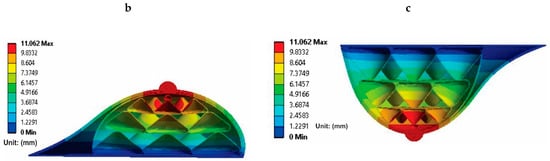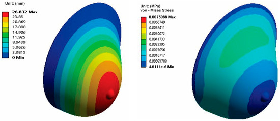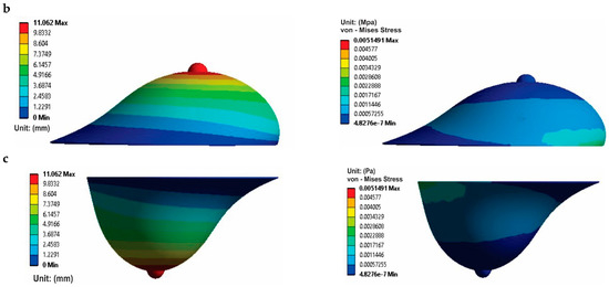 The case for a standing person is one of the most important because it is one of the predominant positions in daily life. Figure 10 shows displacements in the range of 0 to 26 mm, with the greatest magnitude of displacement found in the nipple. Likewise, the distribution of displacements in the prosthesis is symmetrical and with good trajectory; it does not present punctual stress (stress concentration) and its maximum stress is approximately 7 Kpa. The prosthesis does not present defects in its form or contour or on its surface for this load case. The results are consistent with that of the profile of deformation and magnitude of displacement reported by [50,51], similar to the deformation of a real breast under the effects of gravity. Cases “b” and “c” represent the positions prone (on all fours) and lying supine. These are the most frequent in a person’s daily life. Figure 11 shows the results obtained under these load cases for displacements and stress.