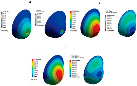 Displacement and Von Mises stress contour plots for case “d”, “e” and “f”, respectively.