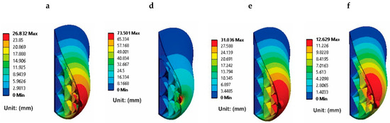 The internal biomimetic structure of the prosthesis behaves satisfactorily for the load cases evaluated, as shown in Figure 15. In this figure can be observed at the displacement contour plots for cases “a”, “d”, “e” and “f” that the displacement values are within the results reported by similar research.