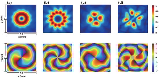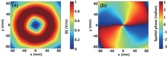 - Allen, L.; Beijersbergen, M.W.; Spreeuw, R.J.C.; Woerdman, J.P. Orbital Angular-Momentum of Light and the Transformation of Laguerre-Gaussian Laser Modes. Phys. Rev. A 1992, 45, 8185–8189. [Google Scholar] [CrossRef] [PubMed]