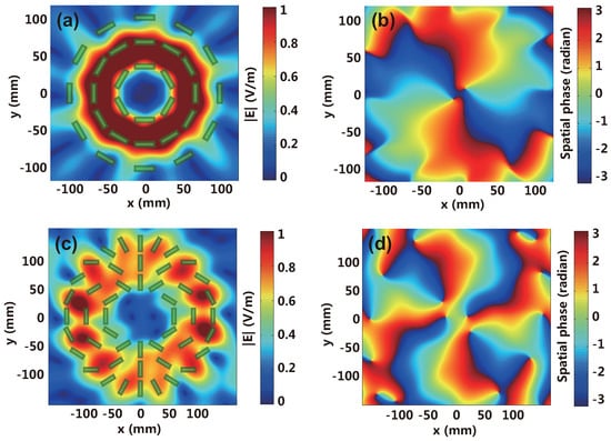 - Kou, N.; Yu, S.X.; Li, L. Generation of high-order Bessel vortex beam carrying orbital angular momentum using multilayer amplitude-phase-modulated surfaces in radiofrequency domain. Appl. Phys. Express 2017, 10, 016701. [Google Scholar] [CrossRef]
