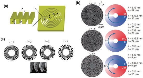 - Genevet, P.; Yu, N.F.; Aieta, F.; Lin, J.; Kats, M.A.; Blanchard, R.; Scully, M.O.; Gaburro, Z.; Capasso, F. Ultra-thin plasmonic optical vortex plate based on phase discontinuities. Appl. Phys. Lett. 2012, 100, 013101. [Google Scholar] [CrossRef]