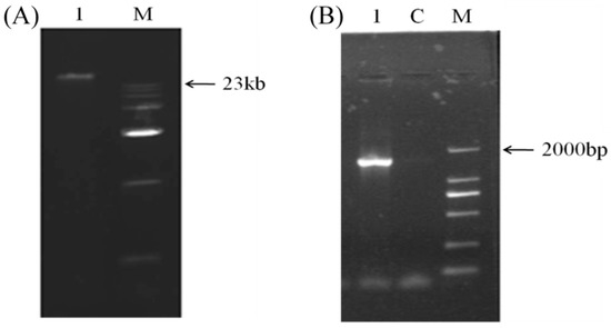 The 0.8% agarose gel electrophoresis map, M: λDNA/Hind III Marker; 1: Lactobacillus plantarum (A); and Polymerase Chain Reaction (PCR) amplification map of lactic acid bacteria 16SrDNA gene, M: DNA Marker; C: Invisible control; 1: Lactobacillus plantarum (B).