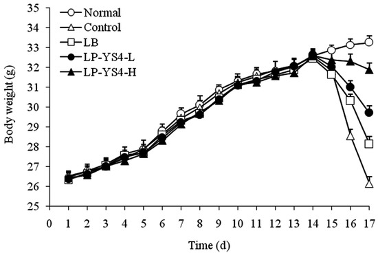 As shown in Figure 2, after treatment with activated carbon, which was used to induce constipation, the body weight of all mice was significantly (p < 0.05) reduced, while LB and LP-YS4 could prevent further weight loss. It is noted that LP-YS4-H (high concentration of LP-YS4) showed the best ability to prevent weight loss. The body weights of mice in LP-YS4-H group were theclosest to the mice in normal group.