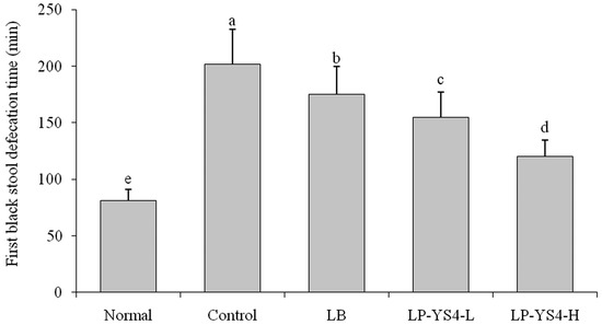 The first black stool defecation time of mice in normal group was shortest which was calculated as 81 min, but in control group it was measured to be 202 min (Figure 3). This time in LB, LP-YS4-L and LP-YS4-H treated mice were 175 min, 155 min and 120 min, respectively.