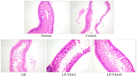 Pathological observation of small intestinal tissue in the Lactobacillus plantarum YS4 and Lactobacillus bulgaricus treated activated carbon-induced constipation mice. LB: Lactobacillus bulgaricus (1.0 × 109 colony-forming unit (CFU)/kg body weight (bw)); LP-YS4-L: Lactobacillus plantarum YS4 low dose (1.0 × 108 CFU/kg bw); LP-YS4-H: Lactobacillus plantarum YS4 high dose (1.0 × 109 CFU/kg bw).