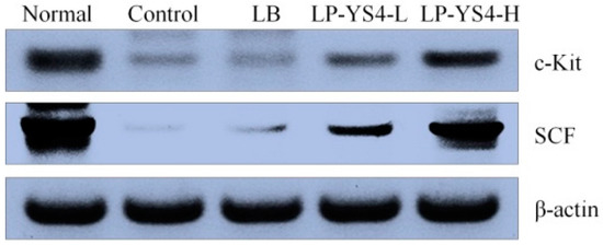 The small intestine tissue of mice in normal group had the strongest c-Kit and SCF mRNA and protein expressions (Figure 5 and Table 8 and Table 9), but the mice in control group had the weakest expressions. LB, LP-YS4-L and LP-YS4-H could increase these expressions as compared to the control group, but the c-Kit and SCF expressions of LP-YS4-H were both higher than LB and LP-YS4-L groups.